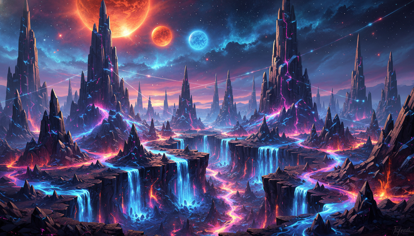 AI-generated fantasy alien landscape with towering jagged crystal mountains glowing in neon pink and blue, cascading waterfalls flowing into luminous rivers, under a starry sky with multiple colorful planets and moons. This content is generated by Artificial Intelligence (AI) Download Image Digital Art / Fantasy / Sci-Fi / AI Generated / Landscapes Where else this image can be used (briefly) This vibrant, otherworldly AI-generated image is highly versatile for sci-fi and fantasy themes: