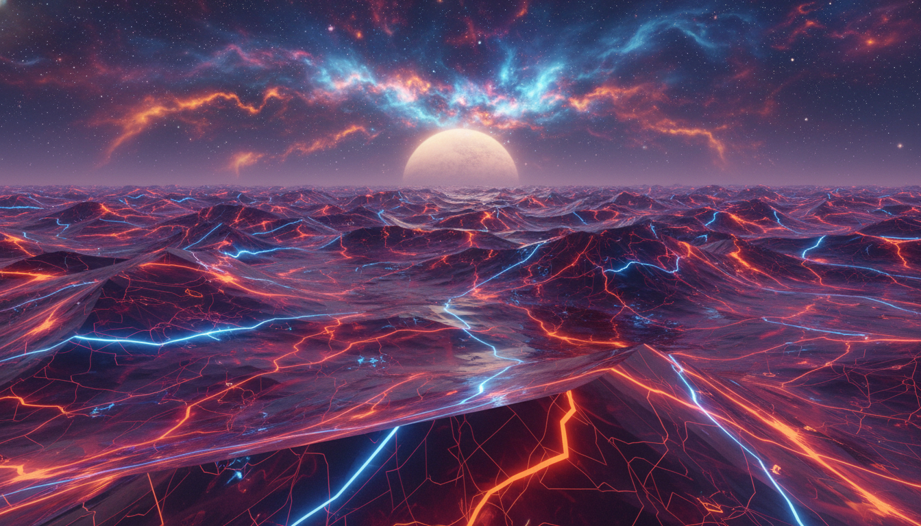 Neon Lava Alien Planet with Giant Moon and Nebula Sky – AI Art
