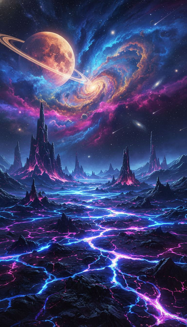 AI-generated surreal alien planet landscape with dark jagged mountains glowing in pink neon, cracked ground illuminated by blue and magenta energy veins, under a cosmic sky with a large ringed planet, swirling colorful galaxy, and shooting stars. This content is generated by Artificial Intelligence (AI) Download Image Digital Art / Sci-Fi / Fantasy / AI Generated / Space Landscapes Where else this image can be used (briefly) This vibrant, cosmic AI-generated image excels in space and fantasy visuals: