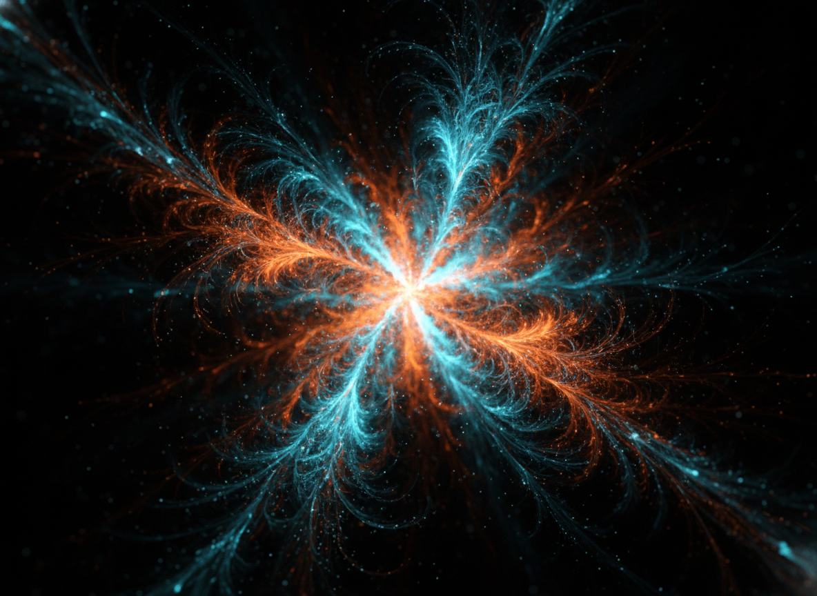 AI-generated abstract fractal cosmic energy burst with symmetric cyan and orange tendrils exploding outward on dark space background This content is generated by Artificial Intelligence (AI) Download Image Fractal Art / Abstract Wallpapers / AI Generated Images / Cosmic & Space Art / Free Download Images / Psychedelic Abstracts Where Else This Image Can Be Used