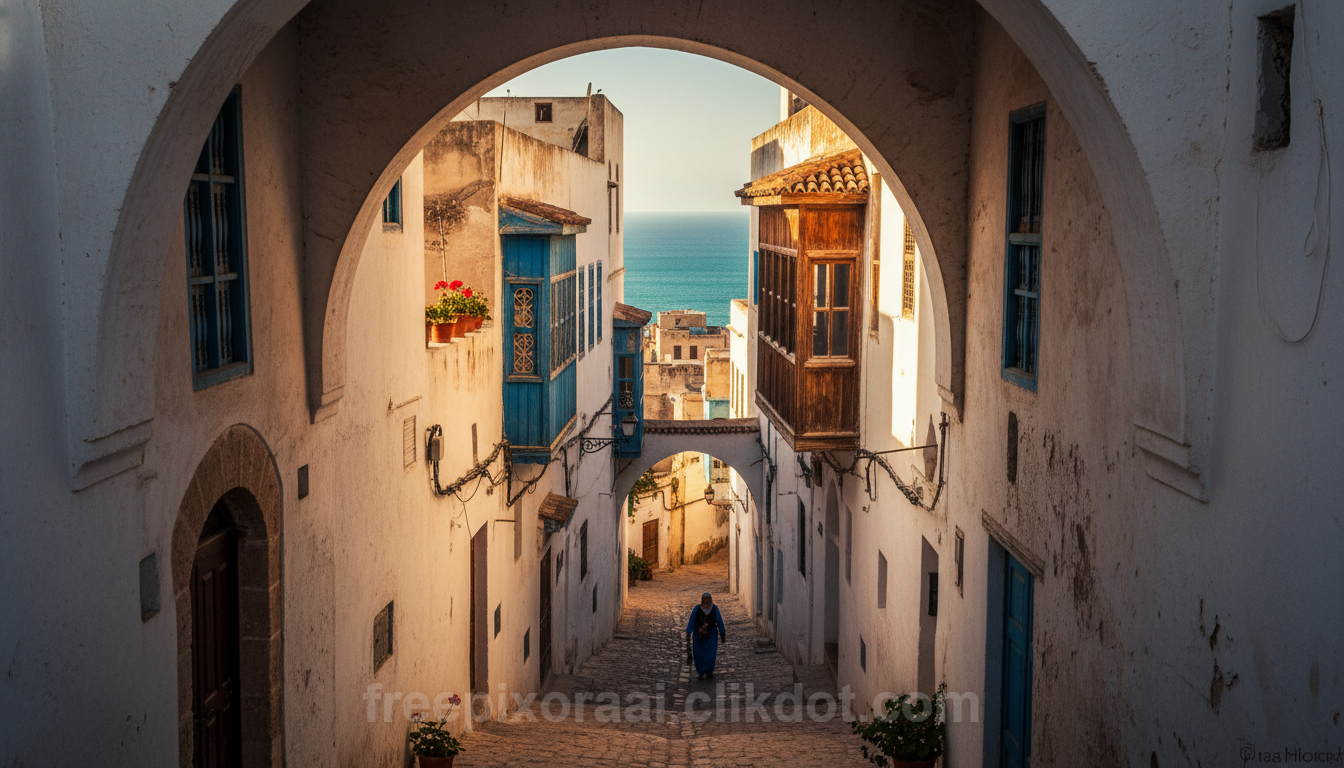 Free AI-generated arched passageway in white Mediterranean old town leading to sea view, cobblestone street with blue balconies and woman walking Download Image Travel & Adventure | Mediterranean & North Africa | Architecture & Streets | Coastal & Seaside | Golden Hour | AI Art | Free Stock Photos Where else this image can be used
