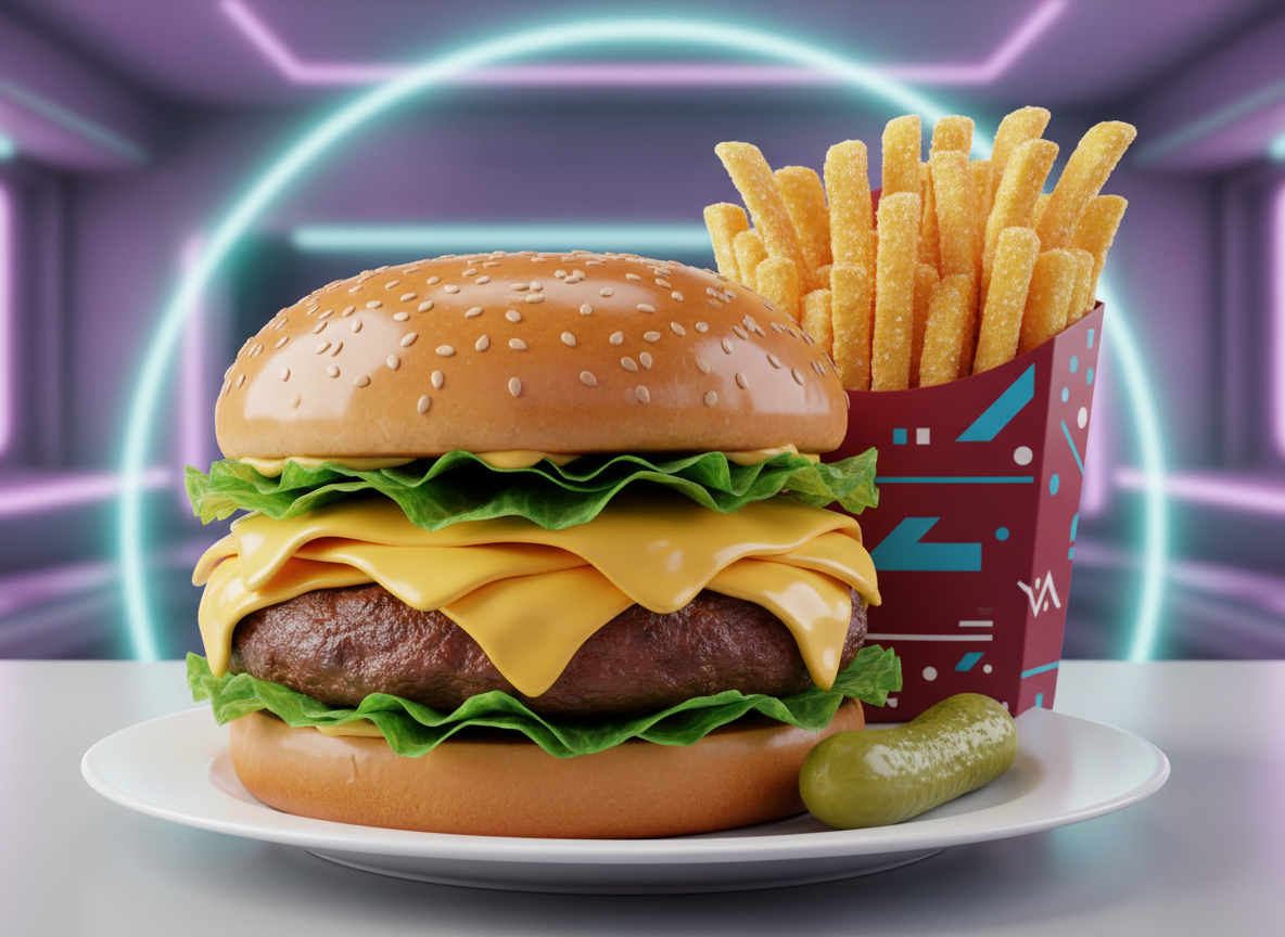 Cute 3D clay-style double cheeseburger with sesame bun, wavy lettuce, melted cheese, beef patty, served with golden french fries in retro container and whole pickle, on white plate with glowing neon purple circular lights background This content is generated by Artificial Intelligence (AI) Download Image Fast Food / Burgers / Junk Food Where Else This Image Can Be Used