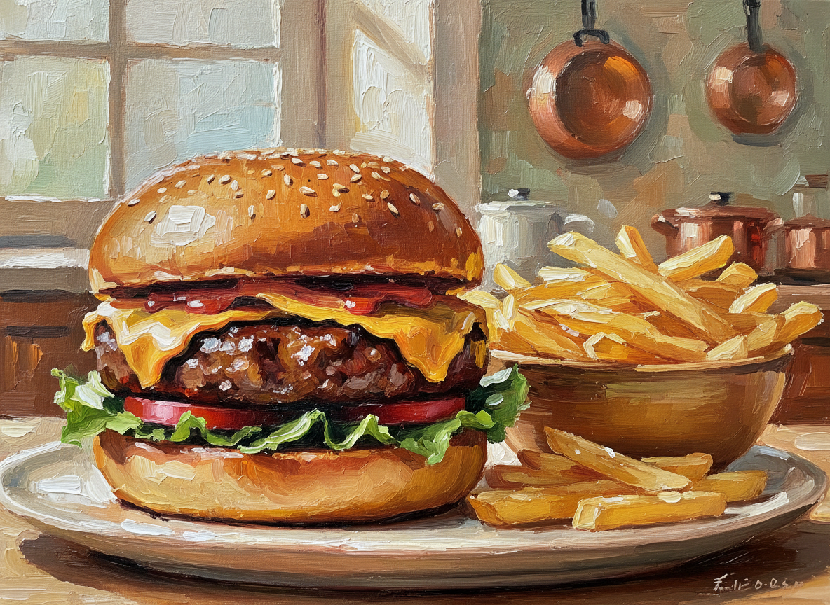 Oil Painting Style Cheeseburger with Fries Kitchen Scene | Free Download