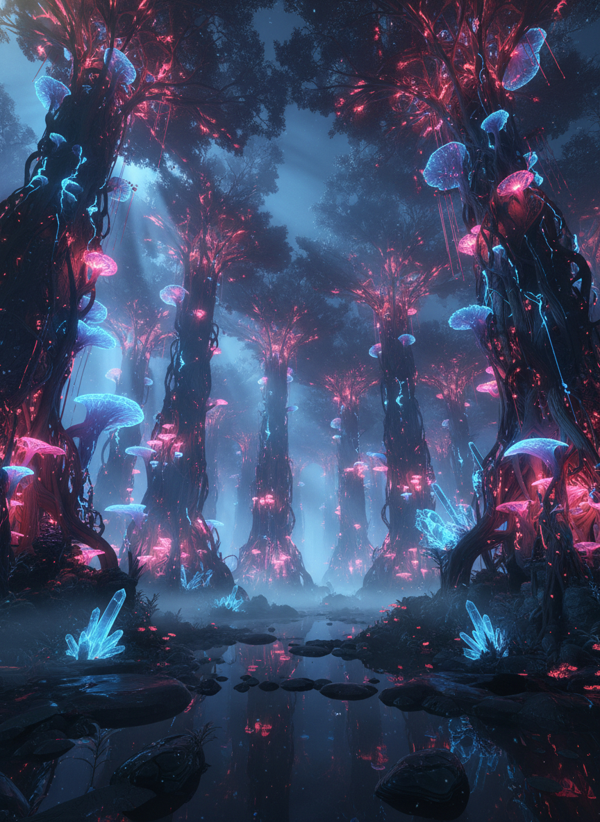 AI-generated surreal fantasy forest scene featuring massive twisted trees covered in glowing pink and cyan bioluminescent mushrooms, ethereal mist, glowing crystal formations, and a reflective watery path in a dark enchanted woodland. This content is generated by Artificial Intelligence (AI) Download Image Digital Art / Fantasy / Sci-Fi / AI Generated / Landscapes / Nature Fantasy / galaxy / universe / Planet Where else this image can be used This mesmerizing, neon-glowing AI-generated fantasy forest is ideal for magical and immersive themes: