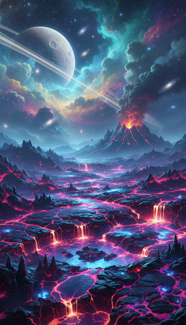 AI-generated surreal volcanic alien planet with massive erupting volcano spewing lava, glowing magenta rivers and falls over jagged dark mountains, beneath a starry sky with ringed pale moon, swirling galaxy, and ethereal blue-pink nebulae clouds. This content is generated by Artificial Intelligence (AI) Download Image Digital Art / Sci-Fi / Fantasy / AI Generated / Space Landscapes / Galaxy Where else this image can be used This dynamic, lava-filled AI-generated sci-fi scene is perfect for cosmic and apocalyptic themes: