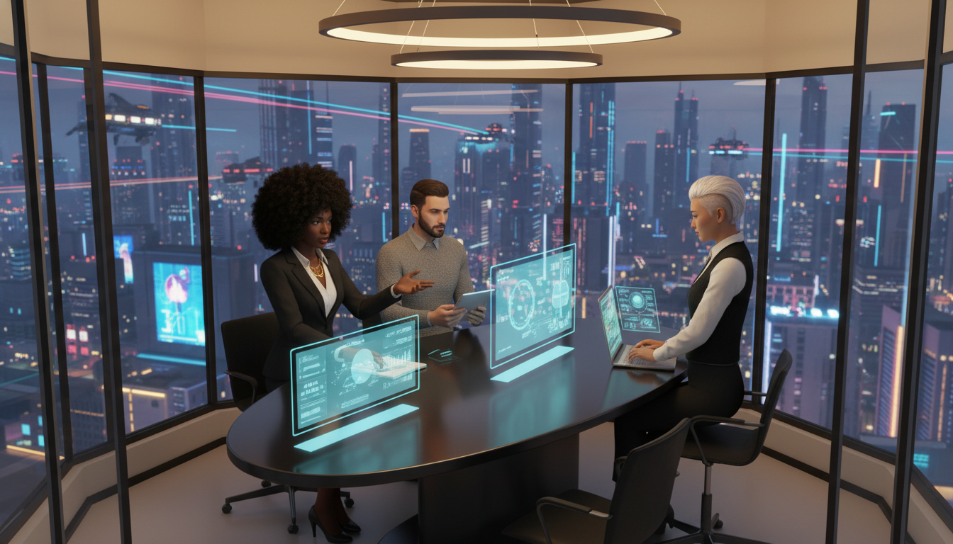 Futuristic Cyberpunk Office Meeting | Diverse Team with Holographic Displays & Neon City View