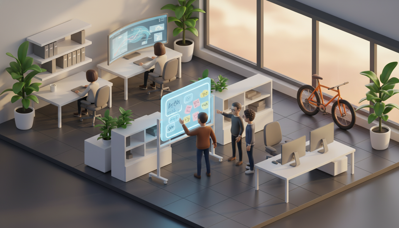 Isometric Modern Office Collaboration | Team Brainstorming with Holographic Board 3D Render