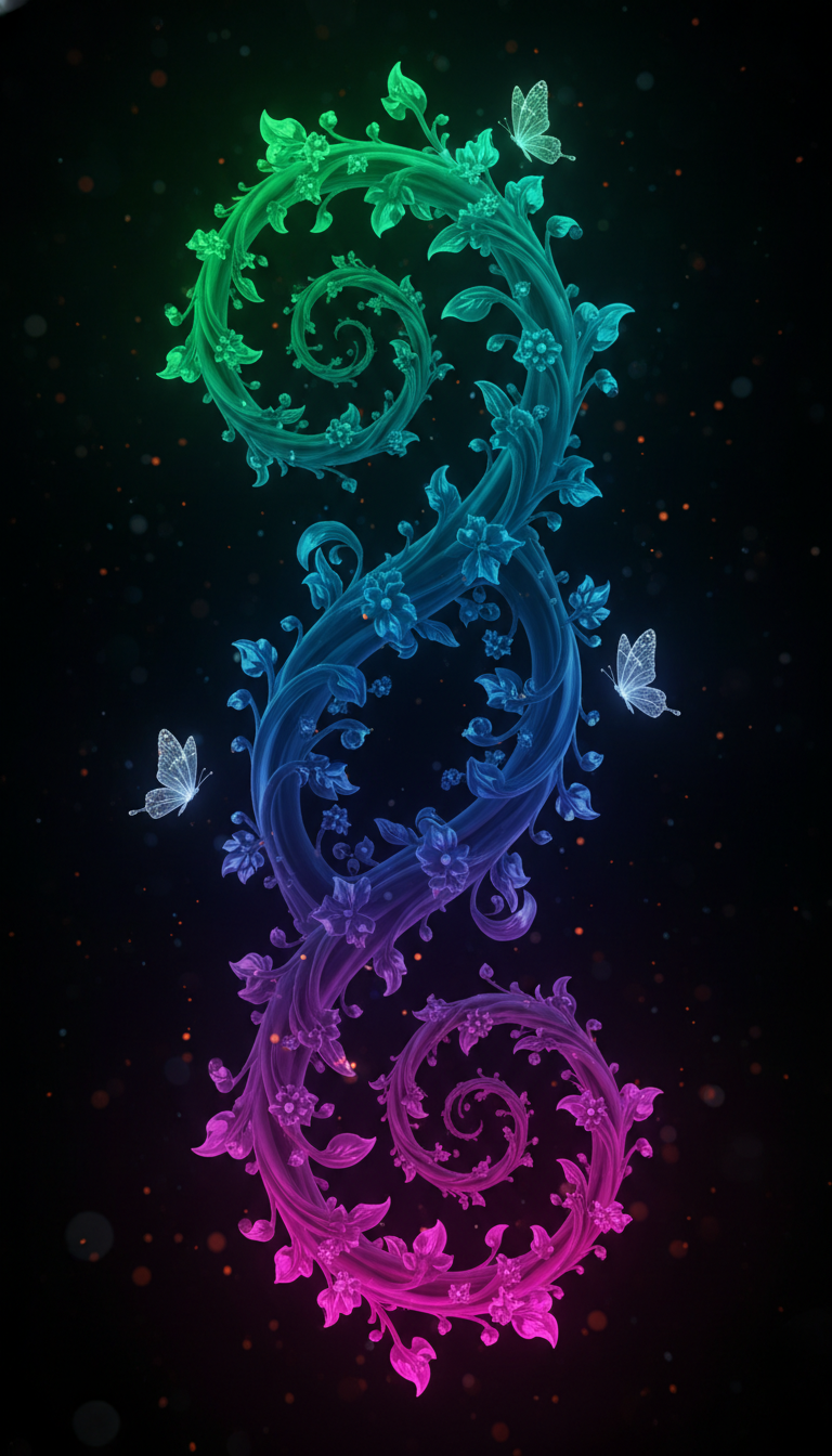 Glowing Floral Vine Spiral with Butterflies | Neon Fantasy Digital Art