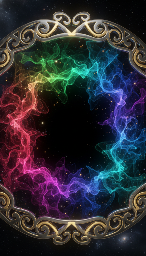 Ornate golden frame surrounding a colorful rainbow nebula smoke circle in deep space with stars