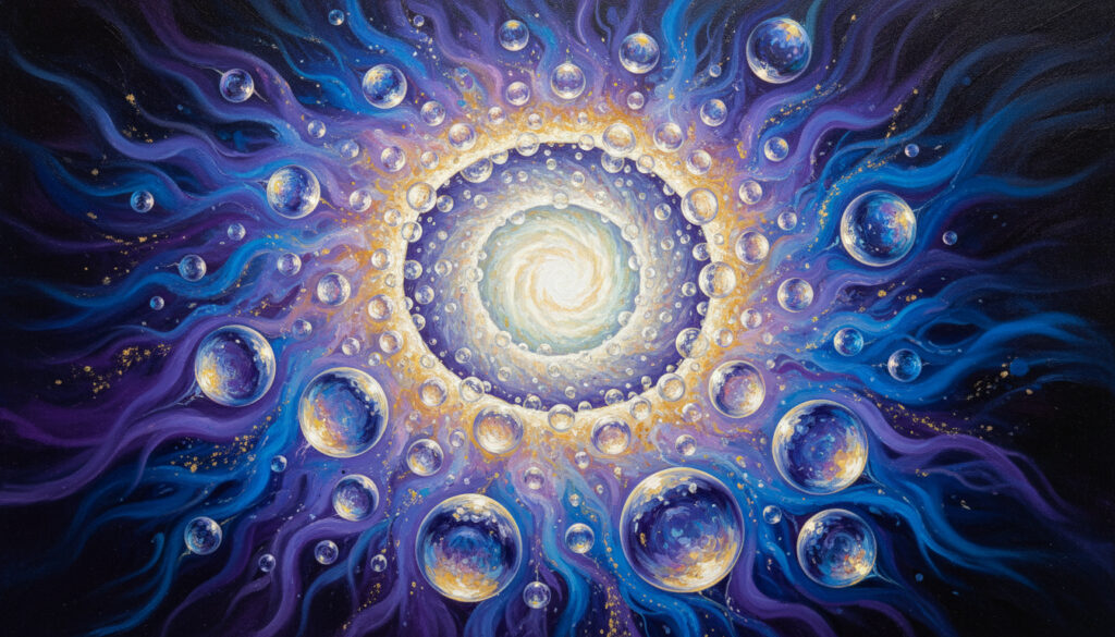 AI-generated surreal cosmic spiral galaxy with glowing spherical bubbles and swirling energy waves in purple blue and gold