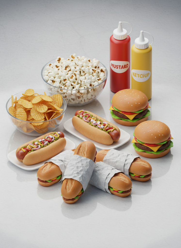 Adorable 3D clay-style fast food assortment: hot dogs with relish and onions, cheeseburgers, popcorn bowl, ridged potato chips, ketchup and mustard squeeze bottles on table