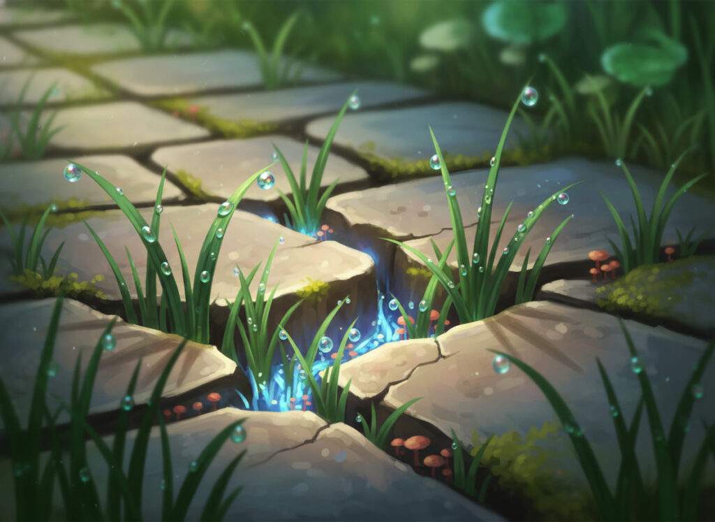 Fantasy illustration of green grass blades and small bioluminescent mushrooms growing through cracks in stone pavement, with dew drops and a subtle blue magical glow