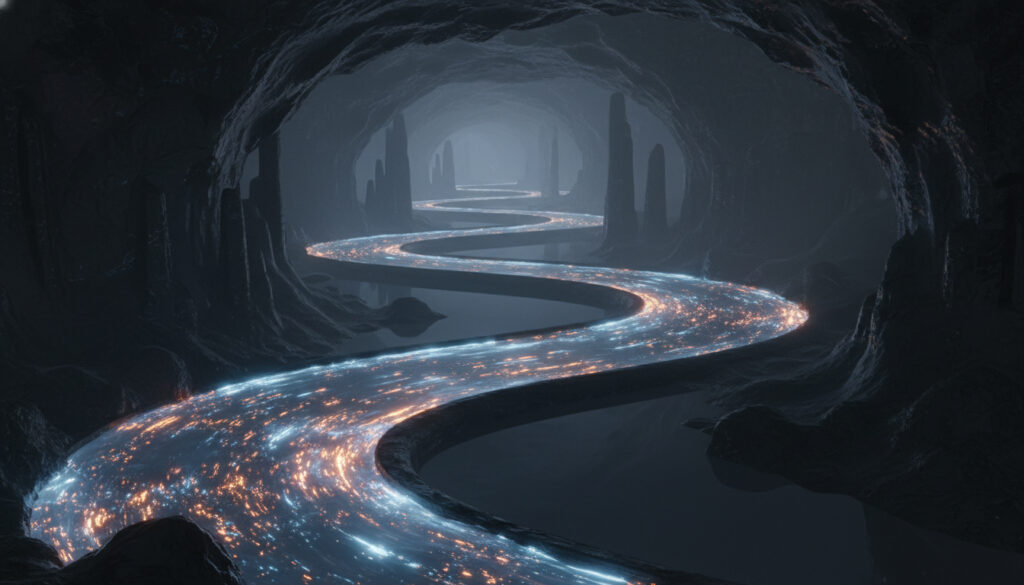 AI-generated fantasy scene of a luminous, winding river path glowing with blue and golden sparkles, curving through a vast dark underground cave lined with stalactites and stalagmites, leading toward a distant ethereal light.