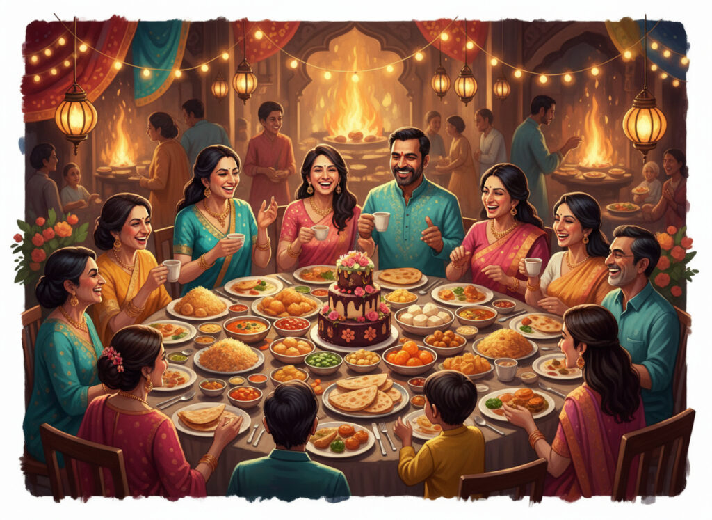 Joyful AI-generated illustration of a large Indian family celebrating around a lavish dinner table filled with traditional dishes, cakes, and sweets, dressed in colorful sarees and kurtas under warm lantern lights.
