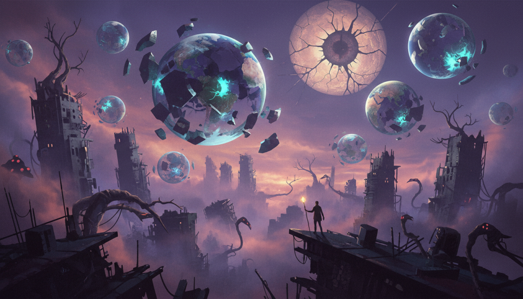 AI-generated surreal post-apocalyptic digital artwork featuring multiple cracked and floating planet fragments in a purple twilight sky, overgrown ruined skyscrapers with tentacle-like alien creatures, and a solitary human figure holding a glowing torch on a rooftop.