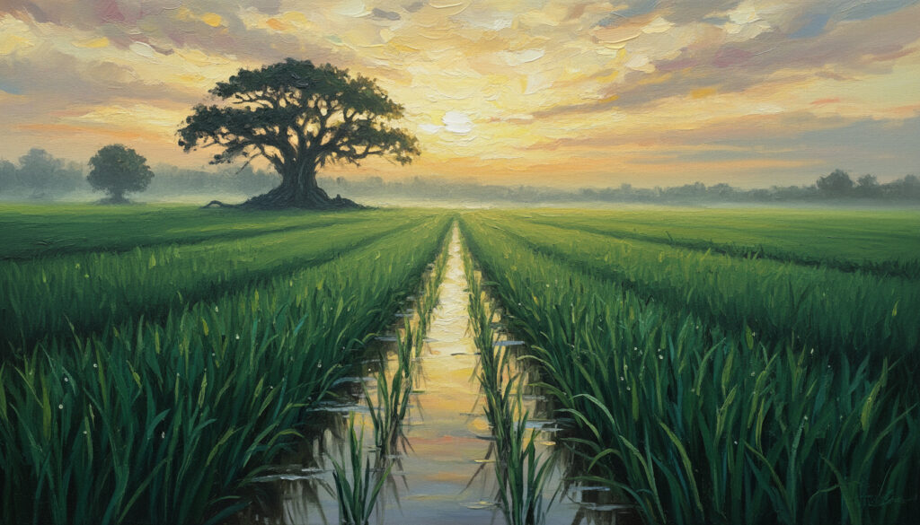 Impressionist oil painting of a flooded rice paddy field at sunrise, with a narrow reflective water channel leading toward a large solitary tree silhouetted against a misty golden sky
